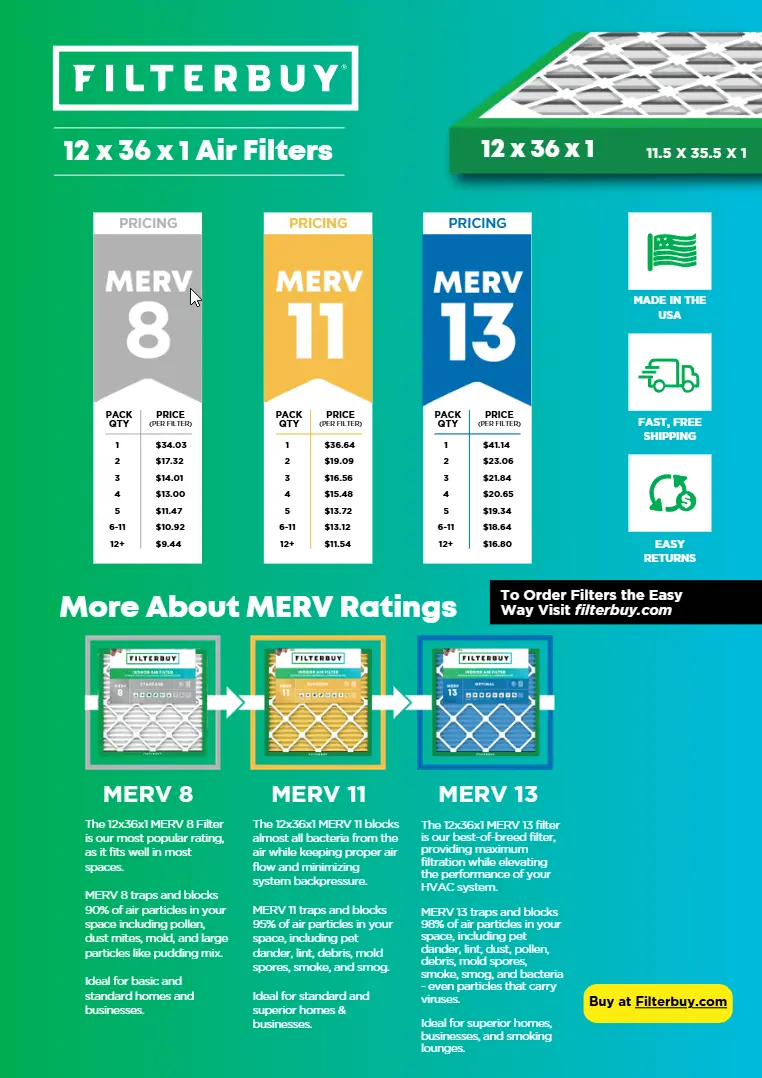 Here, we go beyond the usual advice — using actual specs from Filterbuy (like their 12×36×1 filters sizing out at ~11.88" × 35.88" × 0.75" for many MERV-rated models) to show you why size really matters. Target+1